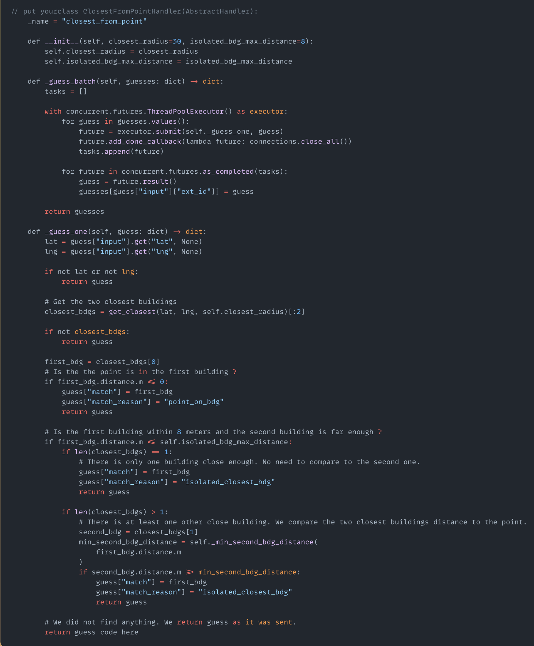 💡 La vérification dans un large rayon (100 mètres autour du point) et la stricte limitation à un seul résultat attendu permet en partie de parer à la confiance limitée que l’équipe du référentiel a pour le moment, au regard du lien bâtiment ↔ adresse.