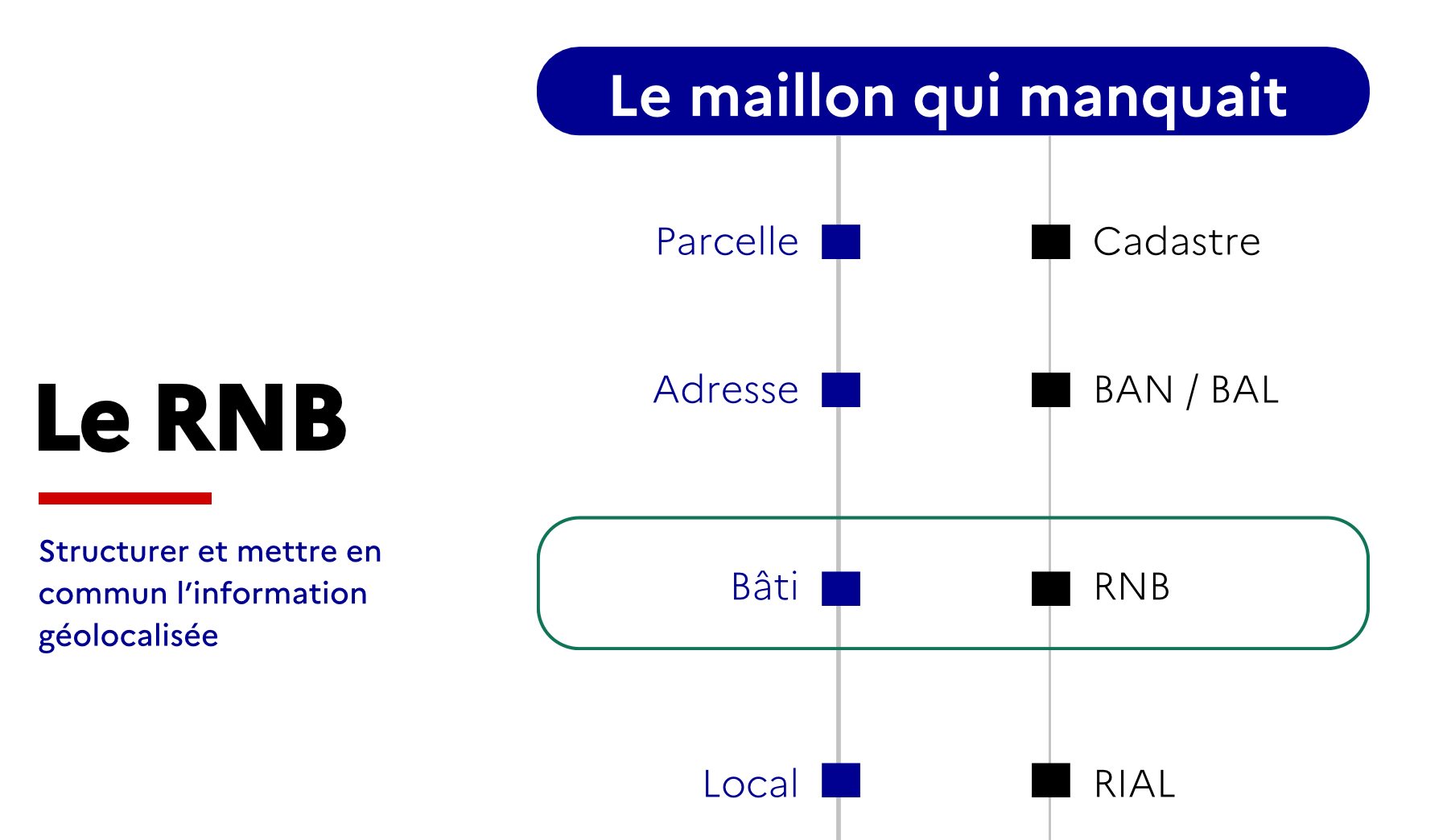 Le RNB associe à chaque bâtiment du territoire français un identifiant unique et pérenne, appelé ID-RNB. Véritable donnée pivot, cet identifiant est composé d’une suite de 12 caractères (chiffres et lettres), contenant les informations suivantes : l'ID-RNB, ses coordonnées géographiques, le statut du bâtiment, son ou ses adresses (référencées dans la Base Adresse Nationale BAN), les identifiants BDNB et BDTOPO associés, les parcelles cadastrales