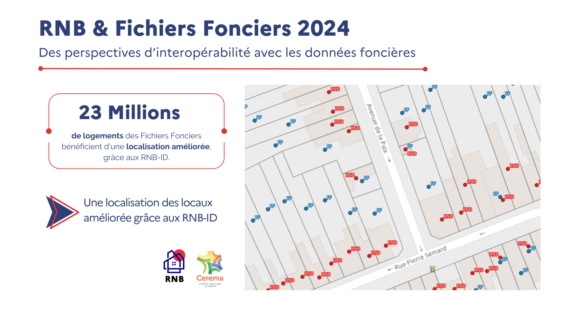 Les identifiants uniques du RNB (ID-RNB) ont été intégrés aux Fichiers fonciers pour renforcer l’interopérabilité avec d’autres bases de données et améliorer leur richesse d'analyse. Ils permettent de connecter plus directement les bâtiments ou les locaux des Fichiers Fonciers à d’autres bases de données qui intègrent ou intégreront prochainement les ID-RNB.
