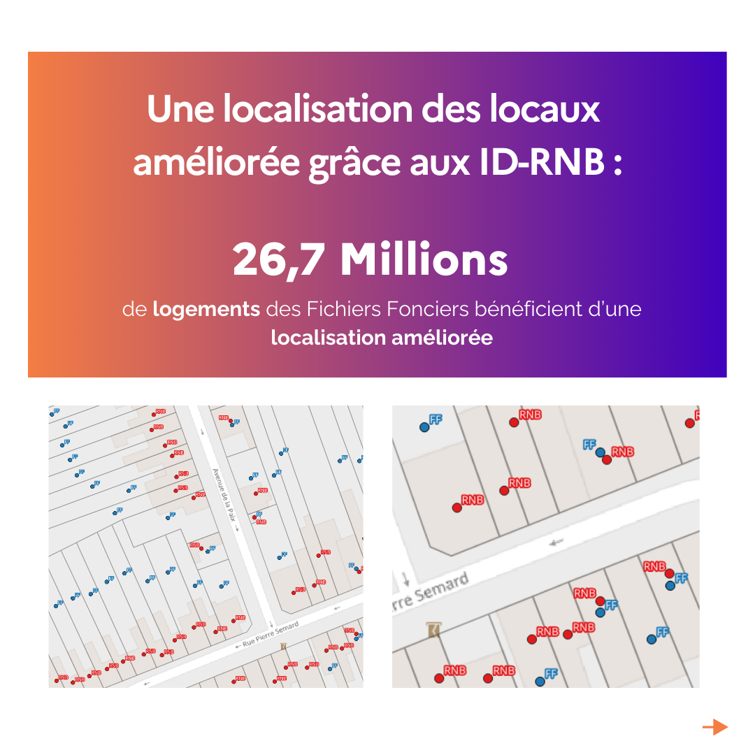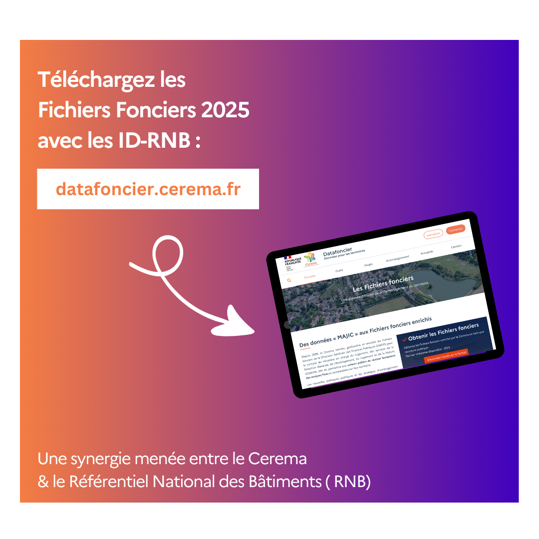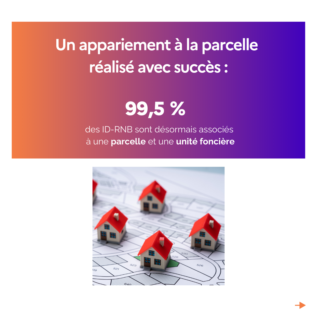 Cette 2eme intégration des ID-RNB dans les Fichiers Fonciers a été réalisée à l’occasion de la mise à jour annuelle des Fichiers fonciers en 2025. L'appariement entre les bâtiments fiscaux et ceux du RNB s'effectue selon une méthodologie à la fois géographique, fondée sur l'intersection des unités foncières et des bâtiments répertoriés dans le RNB, et sur les caractéristiques des bâtiments, telles que le nombre d'unités, le nombre d'étages, le nombre de logements, la date d'apparition, les matériaux des murs, les matériaux de la toiture et l'emprise au sol.