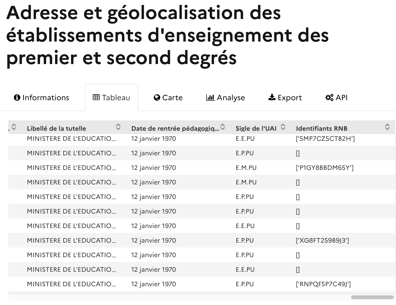 Chaque établissement scolaire (écoles, collèges, lycées, CFA, enseignement supérieur, public ou privé) possède un code unique inscrit dans le répertoire académique et ministériel sur les établissements du système éducatif (RAMSESE) : le code UAI (Unité Administrative Immatriculée).Il est composé de 7 chiffres et d’une lettre. Bien que ce code UAI soit essentiel, il peut être constaté que celui-ci :
